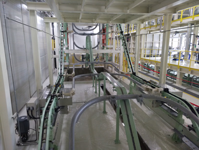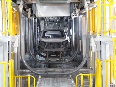2、 浸槽垂直爬坡角度大(45°),入槽速度快,排氣好??s短了前處理和電泳設備的長度。降低了前處理設備成本。